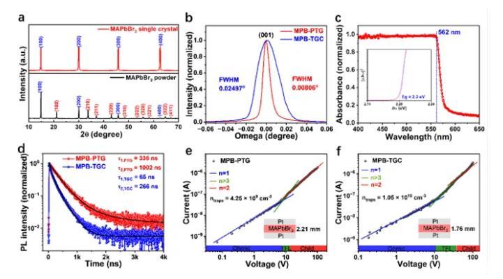 圖3.MAPbBr3鈣鈦礦單晶的表征。(a)粉末XRD和最大面XRD圖譜;(b)XRD搖擺曲線;(c)吸收曲線和禁帶寬度;(d)熒光壽命曲線;(e)和(f)I-V測試曲線。