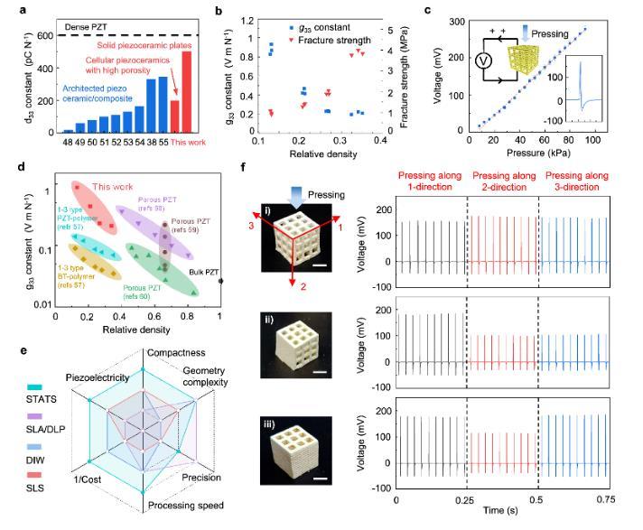 為進(jìn)一步闡述所開發(fā)的STATS制造工藝的優(yōu)異性,研究團(tuán)隊(duì)制備了一系列經(jīng)過三維結(jié)構(gòu)設(shè)計(jì)的多孔壓電陶瓷,并對(duì)其機(jī)械性能和壓電性能進(jìn)行了表征(圖2)。STATS法加工的多孔壓電陶瓷具有整體多孔但局部致密的特點(diǎn),即使在相對(duì)密度(多孔陶瓷與實(shí)心塊體陶瓷的密度比值)較低的情況下(0.13-0.34),也能具有較高的斷裂強(qiáng)度(1.0-3.9 MPa)和壓電常數(shù)d33(200 pC N-1)。為進(jìn)一步評(píng)估壓電陶瓷超材料的壓電響應(yīng),研究團(tuán)隊(duì)基于由周期性結(jié)構(gòu)單元組成的有機(jī)骨架制備了一系列具有不同三維結(jié)構(gòu)的多孔壓電陶瓷,該方法加工的壓電陶瓷展示出優(yōu)異的壓電響應(yīng)和各向異性。