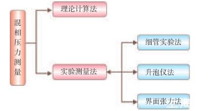 目前測量混相壓力的方法如圖3所示。國內外許多專家研究了確定最小混相壓力的方法,包括理論計算和實驗測定。但是,一般的理論計算精確度都不高,而實驗測定方法具有較高的可靠性。實驗測定方法包括細管實驗、升泡儀法及界面張力法等。其中,界面張力法是通過直接測定注氣相與地層原油間的界面張力來確定最小混相壓力,既能觀測到形成混相的狀態,而且操作時間也較短。細管實驗法被認為是最可靠的測量最小混相壓力方法,但細管實驗也有局限性,不能模擬黏性指進、重力超覆等因素,實驗周期長,大約需要7~14天,且實驗工作量大。升泡儀法是直接觀察混相過程,測量周期短,1h可以完成測量,測量結果受人為因素影響嚴重。而界面張力法是通過直接測定注氣相與地層原油間的界面張力來確定最小混相壓力,既能觀測到形成混相的狀態,而且操作時間也較短,僅需5~6h。