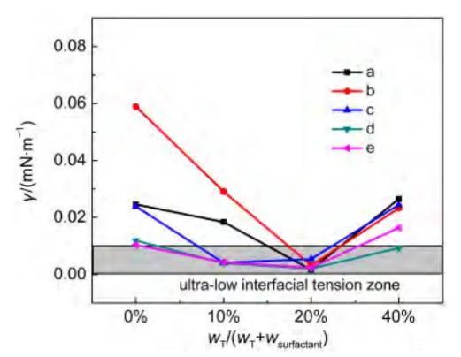 從圖3可見(jiàn),在所考察的五個(gè)油水體系中,界面張力先隨保護(hù)劑T的比例增加而下降。當(dāng)保護(hù)劑加入量達(dá)到10%-20%(摩爾分?jǐn)?shù))時(shí),即達(dá)到最低界面張力。當(dāng)進(jìn)一步加入非離子保護(hù)劑時(shí),界面張力值反而有所上升。這是因?yàn)楫?dāng)較少的非離子保護(hù)劑加入時(shí),可有效控制陰陽(yáng)離子表面活性劑混合體系的沉淀,使混合體系的表面活性劑有效濃度增加。而當(dāng)保護(hù)劑T比例進(jìn)一步增加時(shí),陰陽(yáng)離子表面活性劑的實(shí)際總量相應(yīng)減少,使得界面上陰陽(yáng)離子表面活性劑的實(shí)際含量降低。上述實(shí)驗(yàn)結(jié)果充分說(shuō)明了保護(hù)劑的具體作用,即保護(hù)劑起到的作用是控制了實(shí)際體系中鈣鎂離子對(duì)陰陽(yáng)離子表面活性劑的不利影響,從而獲得了合理的油水兩相表面活性劑濃度的平衡,但是其本身并沒(méi)有對(duì)超低界面張力的獲得有實(shí)質(zhì)性貢獻(xiàn),是陰陽(yáng)離子表面活性劑在有效地降低實(shí)際油水界面張力。
