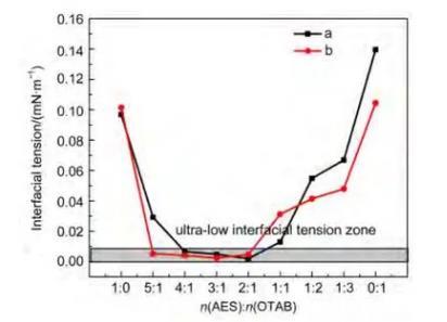 AES/烷基季銨鹽CTAB摩爾比為1:1的混合體系的β參數(shù)計(jì)算結(jié)果為~20.4,表明AES與烷基季銨鹽CTAB親水基間具有極強(qiáng)的吸引作用。值得注意的是,該體系還具有很高的溫度穩(wěn)定性,在55°C時(shí)仍能保持30 mN·m-1以下的表面張力。這說(shuō)明在較高溫度時(shí)該體系的分子排列仍然較為緊密,這和陰陽(yáng)離子表面活性劑體系中分子因靜電吸引造成的緊密排列是密切相關(guān)的。考慮到油水界面張力同樣與界面上的分子排列有關(guān),因此有可能在溫度較高時(shí)實(shí)現(xiàn)超低界面張力。