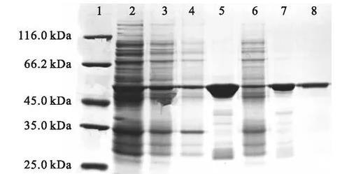 圖1失活型VhPLD的表達(dá)與純化SDS-PAGE電泳圖注:1.蛋白marker;2.菌體破碎液;3.菌體破碎后離心所得上清液;4.菌體破碎后離心所得沉淀;5.鎳柱純化所得100 mmol/L咪唑洗脫峰樣品;6.鎳柱純化的上樣穿過峰樣品;7.G-25柱純化的洗脫峰樣品;8.Q柱純化的300 mmol/L氯化鈉梯度洗脫峰樣品。