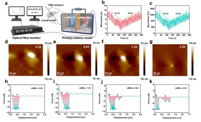 圖2電極材料的應力-電化學測試。(a)光纖布拉格光柵傳感器(FBG)在液態金屬中的應力-電化學測試示意圖。(b,c)FBG在液態金屬中的應力響應圖。(d-g)不同電壓下軟包電池中LMNCs的AFM測試圖。(h-k)不同電壓下的LMNCs力-位移曲線圖。