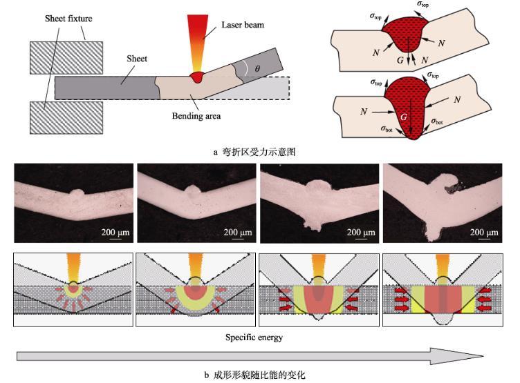 通過觀察激光熱應(yīng)力成形過程中彎折處的形貌發(fā)現(xiàn),激光熱輸入、彎曲角度和成形機(jī)制會影響彎折區(qū)材料表面的擠壓、熔化、流動和凝固過程,以及材料內(nèi)部的溫度梯度和界面表面張力,這些影響導(dǎo)致彎折區(qū)域的輪廓形貌、粗糙度、顯微組織、硬度分布發(fā)生變化。在激光熱應(yīng)力成形過程中,熔池的受力情況如圖1a所示。一方面,當(dāng)比能較小且熔凝區(qū)僅存在金屬板上表面時,薄板彎折處的增厚主要受到左右兩側(cè)和下側(cè)冷端材料的約束作用,通過作用于上側(cè)材料,且上表面局部熔化的材料在頂端表面張力的作用下,形成了頂部凸起的形貌。同時,由于激光瞬態(tài)作用時間較短,熔融材料在激光掃描結(jié)束后快速凝固,并在掃描次數(shù)逐漸增加的過程中形成連續(xù)隆起的形貌,在彎折處形貌演變過程中粗糙度逐漸增大。在高比能下,薄板彎折處材料的熔化凝固和塑性變形受到左右兩側(cè)材料的橫向約束,該區(qū)域在左右兩側(cè)材料的擠壓下增厚。