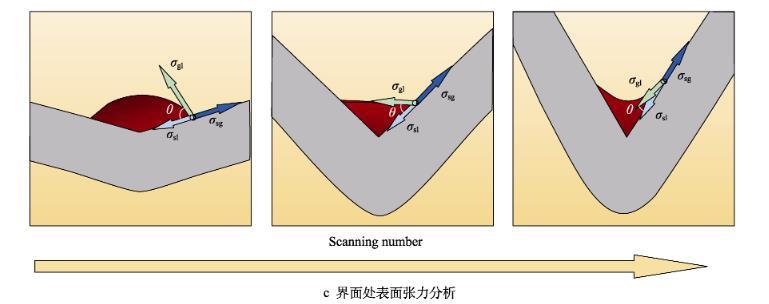 通過對成形過程彎折區(qū)域材料的溫度梯度和界面表面張力進(jìn)行分析可知,激光熱應(yīng)力成形界面處的表面張力與潤濕角θ的關(guān)系可用楊氏方程表示,見式(1)。在成形結(jié)束后,界面表面張力的矢量和為零,同時熔凝層表面張力與溫度梯度存在如式(2)所示的關(guān)系。