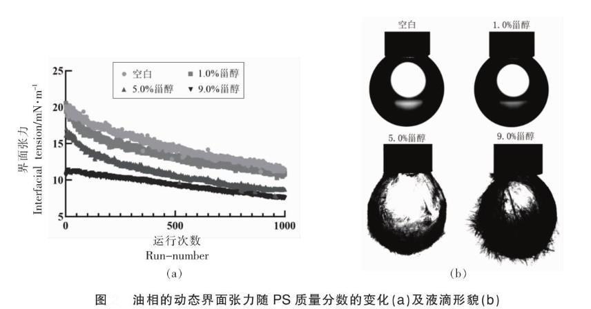 首先,將連接在毛細管上的不銹鋼針(外徑為1.65mm)插人盛有油相的玻璃槽內。將針尖端放置在光源和相機(CCD)之間的光學平板上。然后用自動進樣單元將10μL的樣品推送至針尖上并形成完整的滴形。CCD攝像系統立即持續地采集液滴的外形輪廓變化,測試時維持油相溫度60℃,盡量避免外界振動的干擾。據Young-Laplace方程算出界面張力(精確至0.01mN/m)。