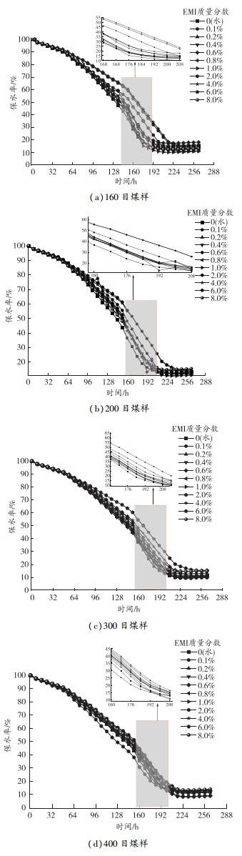 對比不同質量分數EMI溶液對不同粒徑煤樣保水率的影響曲線(見圖9)可以發現,在160目測試煤樣中,煤樣在溶液中EMI質量分數為1.0%時靜置,出現了析水現象。相比于160目測試煤樣,200目和300目測試煤樣分別在EMI質量分數為2.0%、6.0%的溶液中靜置,出現了析水現象。160、200、300目3組測試煤樣,在EMI質量分數小于6.0%的溶液的保水率在216 h后趨于穩定,400目測試煤樣在208 h后趨于穩定;而在EMI質量分數為6.0%與8.0%溶液中,160、200、300、400目測試煤樣分別在240、248、232、216 h后保水率趨于穩定,穩定時間均大幅提高。說明溶液中EMI質量分數越高,煤塵的保水效果越好。