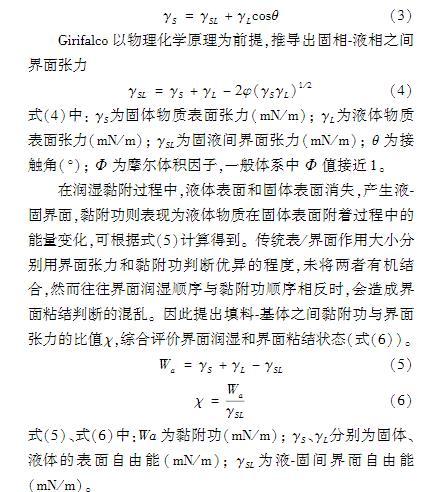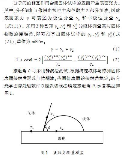 接觸角法屬于熱力學(xué)方法,以浸潤(rùn)理論為基礎(chǔ),當(dāng)液體與固體填料表面接觸時(shí)達(dá)到浸潤(rùn)平衡。YoungT以一種液體附著在另一種固體上作用力平衡為前提條件,提出了著名的楊氏方程