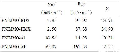 將表1中的接觸角測(cè)試結(jié)果代入式(2)中,利用Owens——Wendt——RabelandKaelble(OWRK)擬合得到PNIMMO及推進(jìn)劑組分的表面張力,如表2所示。5種樣品的表面張力大小順序?yàn)椋害茫ˋP)>γ(RDX)>γ(HMX)>γ(PNIMMO)>γ(Al),其中PNIMMO、RDX、HMX和AP中表面張力的極性分量γp均遠(yuǎn)大于色散分量γd,說明其表面張力中極性分量貢獻(xiàn)更多;而相反Al粉表面張力中色散分量對(duì)其表面張力作主要貢獻(xiàn)。一般而言,當(dāng)粘合劑的表面張力小于推進(jìn)劑中單質(zhì)固體組分的表面張力時(shí),粘合劑才能較好地包覆于推進(jìn)劑表面。PNIMMO的表面張力為35.52mN/m,明顯小于RDX、HMX及AP的表面張力,說明PNIMMO比較容易鋪展于其他固體物質(zhì)表面。即PNIMMO對(duì)RDX、HMX和AP3種固體組分的包覆效果良好。