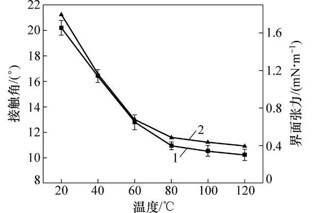 對(duì)20,40,60,80,100和120℃溫度下DBTL在CBT500光滑薄板上靜態(tài)接觸角進(jìn)行測(cè)量,結(jié)果如圖4所示。結(jié)合上述溫度下DBTL界面張力1(如圖3所示),將和1代入式(3),計(jì)算相應(yīng)溫度下DBTL與CBT500的接觸角法界面張力12,結(jié)果如圖4中界面張力所示。由圖4可知:隨著溫度升高,接觸角和接觸角法界面張力具有相同的下降規(guī)律,不同溫度區(qū)間內(nèi)下降趨勢(shì)不同,20~60℃溫度區(qū)間下降趨勢(shì)最大,60~80℃溫度區(qū)間下降趨勢(shì)次之,80~120℃溫度區(qū)間下降趨勢(shì)平緩。由Young方程可得cos=(2?12)/1,代入上述關(guān)系,即溫度升高,接觸角減小;除此外,不同溫度區(qū)間內(nèi),DBTL對(duì)CBT500初期誘導(dǎo)率不同,從而導(dǎo)致不同溫度區(qū)間內(nèi)靜態(tài)接觸角、界面張力下降趨勢(shì)不一致。