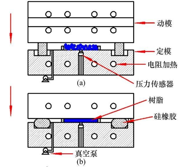 測(cè)定薄板分別由2種材料CBT500和PP制成,用于一定溫度下不同材料液滴在相應(yīng)薄板上靜態(tài)接觸角的測(cè)量。采用抽真空熱壓工藝制備光滑薄板,成型工藝參數(shù)如表1所示,具體過(guò)程為:采用信易SCD?20μ/30H干燥機(jī)對(duì)CBT500和PP顆粒進(jìn)行干燥,干燥溫度、時(shí)間分別為80℃和24 h。采用HH?138的精密烤箱對(duì)干燥后CBT500和PP顆粒分別進(jìn)行預(yù)加熱,加熱溫度分別為140℃和160℃,加熱時(shí)間均為0.5 h。將預(yù)加熱CBT500和PP顆粒分別倒入溫度為130℃和150℃的模具中,采取抽真空熱壓工藝制備CBT500和PP光滑薄板。抽真空熱壓工藝包括6個(gè)階段:1)動(dòng)模降至密封圈;2)抽真空;3)施壓;4)保壓;5)冷卻;6)開(kāi)模取件。為獲得良好的密閉空間,動(dòng)模應(yīng)迅速下降至密封圈并微壓,如圖2(a)所示。抽真空后,施加壓力將CBT500和PP顆粒壓實(shí),制成相應(yīng)光滑薄板,如圖2(b)所示。