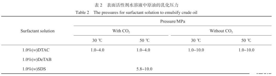 實驗中觀察到原油的乳化情況與體系壓力及CO2存在與否的相關(guān)性,表2是CO2存在與CO2不存在條件下,1.0~10.0 MPa范圍內(nèi),表面活性劑水溶液中原油的乳化壓力。50℃時,在DTAC水溶液/原油體系中,CO2不存在時,水靜壓在1.0~10.0 MPa范圍內(nèi),始終存在原油的乳化現(xiàn)象。CO2存在時,體系壓力低于4.0 MPa時,存在原油的乳化現(xiàn)象,隨著CO2壓力升高,油水界面張力增大,原油乳化現(xiàn)象消失。說明在DTAC水溶液/原油體系中,CO2的存在不利于原油的乳化。50℃時,在SDS水溶液/原油體系中,CO2不存在時,水靜壓從1.0 MPa升高至10.0 MPa過程中,始終未出現(xiàn)原油的乳化現(xiàn)象。CO2存在時,體系壓力升高到5.8 MPa以上,原油開始出現(xiàn)乳化、拉絲的現(xiàn)象。這說明CO2的存在有利于SDS水溶液乳化原油。其原因如下:一方面CO2的存在降低了SDS水溶液與原油的界面張力;另一方面,CO2通過水相擴散進入原油中,降低了原油的黏度,增強了原油的流動性,同時CO2對原油中輕質(zhì)組分的萃取,也有助于原油中的輕質(zhì)組分擴散進入水相。因此高壓CO2增強了SDS水溶液對原油的乳化作用。在DeTAB水溶液/原油體系中,油水界面張力較大,無論CO2存在與否,始終沒有原油乳化現(xiàn)象的發(fā)生。