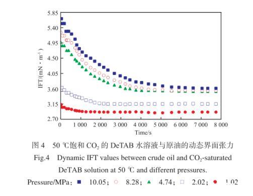 圖4 50℃飽和CO2的DeTAB水溶液與原油的動態(tài)界面張力