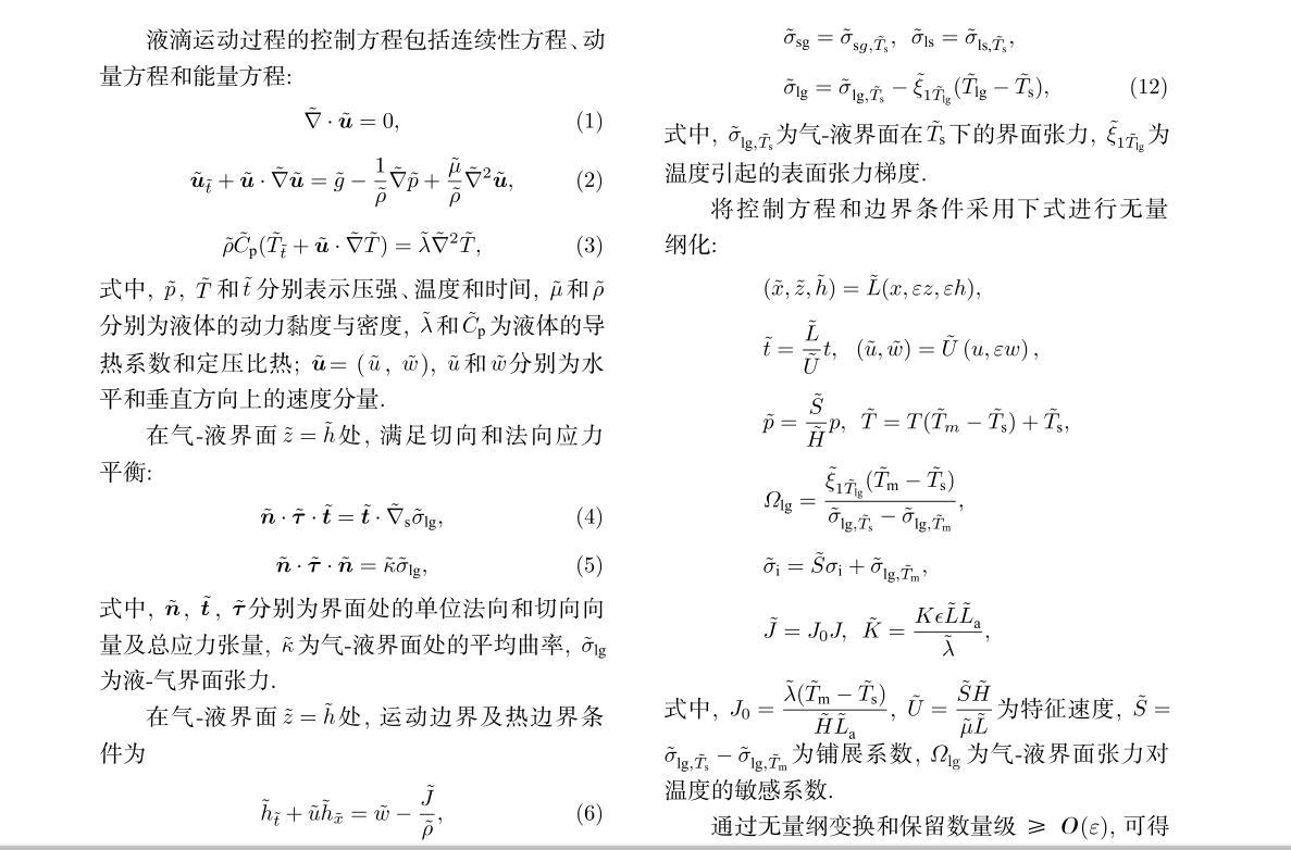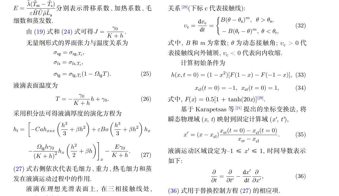(27)式右側依次代表毛細力、重力、熱毛細力和蒸發在液滴運動過程中的作用.