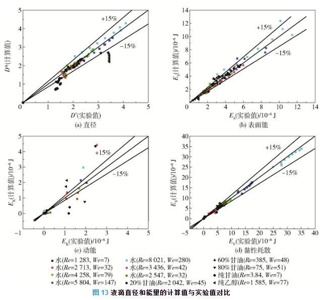 圖13為液滴直徑和能量的計算值與實驗值對比??梢钥闯觯旱沃睆降挠嬎阒岛蛯嶒炛档钠骄`差約為15%(圖13(a)),液滴表面能的計算值和實驗值的平均誤差約為15%(圖13(b)),液滴動能的計算值和實驗值的誤差較大,最大誤差約為50%(圖13(c)),液滴黏性耗散的計算值和實驗值的誤差小于15%(圖13(d))。