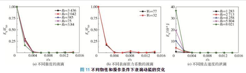 圖11(b)為水和乙醇液滴在撞擊過程中動能隨時間的變化??梢钥闯?,液滴在鋪展過程中動能的減小量和減小的速率不隨表面張力系數(shù)而變化。