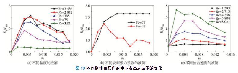 圖10為不同物性和操作條件下液滴表面能的變化。由圖4(a)、圖7(a)和式(19)均可得到液滴鋪展直徑和鋪展面積隨時間先增大后減小的一般規(guī)律,且隨著黏度的增加,液滴的鋪展直徑和鋪展面積均減小,液滴表面能增加的速率也在降低。