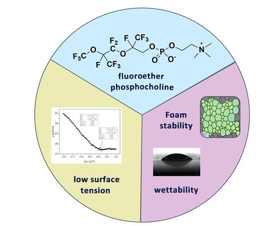 將氧原子引入到氟磷酸膽堿表面活性劑中,會(huì)對(duì)磷酸膽堿性能產(chǎn)生怎樣的影響呢?我們?cè)O(shè)計(jì)合成了一種新型氟醚磷酸膽堿表面活性劑(圖1b),考慮到長(zhǎng)氟碳鏈和長(zhǎng)氟醚鏈段具有生物累積性,我們選用了氟碳鏈為6的短鏈結(jié)構(gòu),并向其中插入兩個(gè)氧原子,將新化合物與一個(gè)鏈長(zhǎng)相近的氟磷酸膽堿表面活性劑進(jìn)行對(duì)比,結(jié)果表明新型氟醚磷酸膽堿表面活性更佳。我們進(jìn)一步探索了新氟醚磷酸膽堿的泡沫性能與潤(rùn)濕性能,結(jié)果表明氟醚磷酸膽堿的穩(wěn)泡性好、可在聚四氟乙烯(PTFE)上潤(rùn)濕,是一類(lèi)具有良好應(yīng)用前景的表面活性劑。