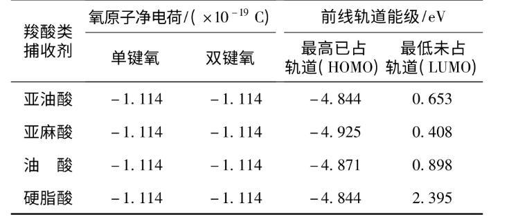 由表2可知,對于18個碳鏈的脂肪酸,碳鏈不飽和度對藥劑的價鍵特性影響明顯。碳鏈的不飽和度對分子最高已占軌道能級和最低未占軌道能級均有明顯影響,但不影響氧原子的凈電荷。