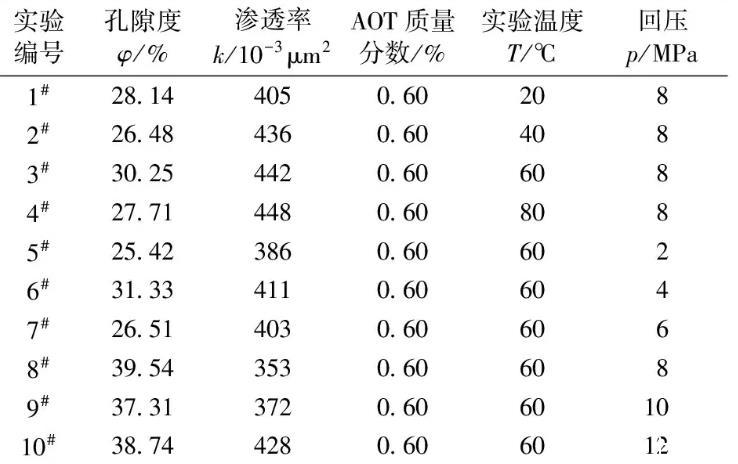 主要實驗材料:選用2-(2-乙基己基)-磺酸琥珀酸鈉(AOT)為表面活性劑;實驗用CO2純度為99.9%;實驗用水為蒸餾水;實驗巖心為填砂管模型,規格參數:600 mm×Φ25 mm。表1、2所給出的回壓值即為巖心中流體所處的最低壓力,只有高于該回壓值,流體才可以流動。