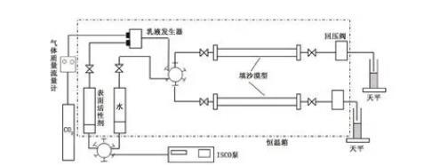 在油藏條件下,CO2一般處于超臨界狀態(31.26℃,7.38 MPa以上),超臨界CO2密度接近液體,與水溶液形成的分散體系稱為乳液更為合適,驅油過程中將超臨界CO2和表面活性劑水溶液形成超臨界CO2乳液是控制CO2流度的有效方法,能夠大幅改善CO2驅油效果。在超臨界CO2乳液驅替過程中,CO2乳液的界面特性會直接影響其穩定性,從而影響CO2乳液在驅替過程中的封堵效果。目前,對CO2乳液的研究主要集中在反相微乳萃取分離、酶催化和納米材料制備等方面。筆者通過實驗研究不同溫度、壓力條件下CO2乳液界面特性及其封堵效果。