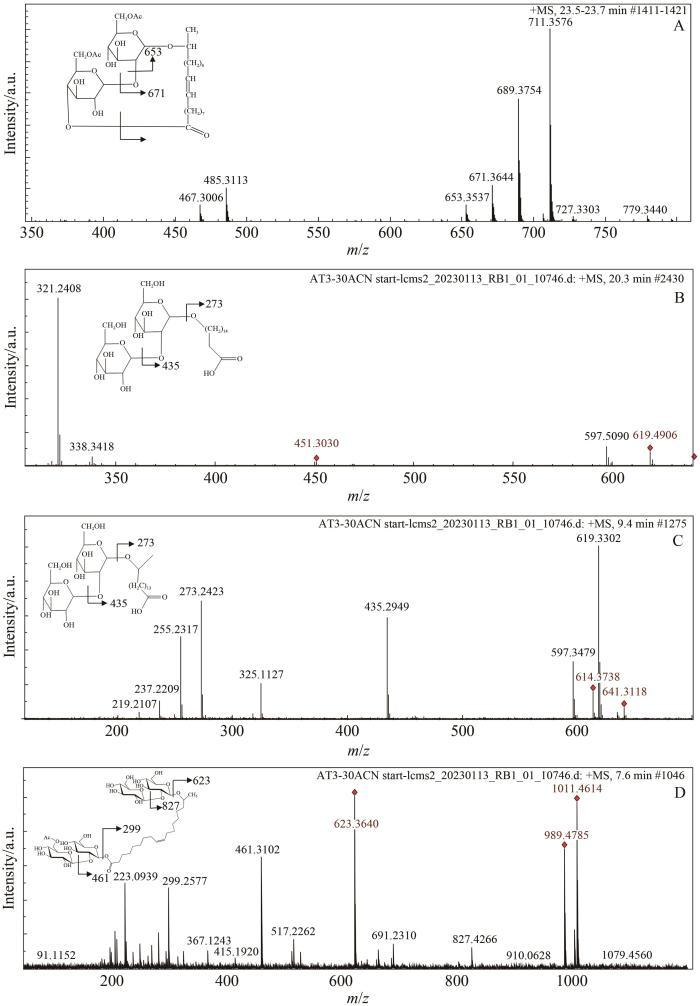 圖2(A)乙酰化SLs保留時間為23.6 min組分的質(zhì)譜圖.(B)去乙酰化SLs保留時間為20.3 min組分的質(zhì)譜圖.(C)去乙酰化SLs保留時間為9.4 min組分的質(zhì)譜圖.(D)去乙酰化SLs保留時間為7.6 min組分的質(zhì)譜圖