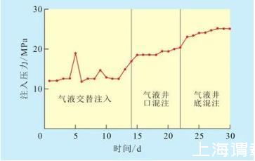 在氣液井口混合注入階段,當氣液比為0.5∶1時,注入壓力由氣液交替注入階段末期的17 MPa上升到18.5 MPa;當氣液比升至0.75∶1時,注入壓力逐漸升至20.3 MPa。