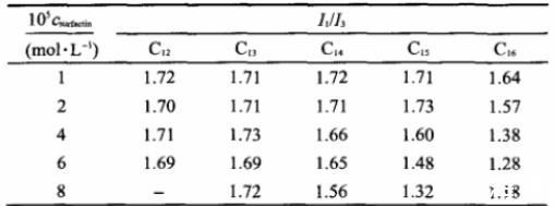 熒光法可以用來研究溶液微環境性質,芘探針的熒光光譜有5個特征峰,其中第一和第三峰的值可以分別表示出探針分子所處微環境中極性和非極性的強弱,第一和第三峰的比值I1/I3可以作為膠束微極性的指標。本實驗用熒光法測定不同濃度表面活性素溶液中芘探針熒光光譜,得到第一和第三峰值的比例,研究表面活性素溶液微環境極性隨表面活性素結構的變化,結果如表3所示。