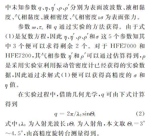 參數ω、τc和q通過實驗的方法獲得。由于式(1)是復數方程,因此η、η′、ρ、ρ′和σ這5個參數知其中3個便可以求得剩余2個。對于HFE7000和HFE7200,其氣相參數η′和ρ′可以通過估算得到,ρ是采用實驗室利用振動管密度計已經獲得的實驗數據,因此通過求解式(1)便可以獲得高精度的σ和η值。