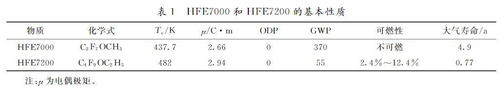 氫氟醚HFE7000、HFE7200具有良好的物化性質和環境性能,是多種化工合成物的原料。如表1所示,HFE7000、HFE7200的臭氧破壞潛能(ODP)均為0,溫室效應潛能(GWP)分別為370和55,大氣壽命為4.9和0.77 a。此外,HFE7000、HFE7200還具有高揮發性、低表面張力,可作為電子元器件的冷卻介質,還可以替代HCFC-141b、HFC-43-10mee作為工業清洗劑。在能源領域,HFE7000還可作為朗肯循環工質,用來回收低溫熱源的低品位能量。