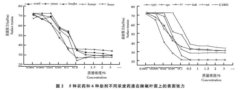 2.1不同農藥及助劑在辣椒葉片上的潤濕性能