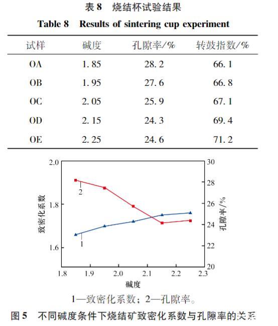 在堿度為1.85~2.25范圍內,燒結試驗表明,致密化系數與實測孔隙率呈現顯著的負相關關系(F_{Den}越大,孔隙率越小)。致密化系數與燒結礦的轉鼓指數(強度)在堿度1.85~2.15范圍內呈正相關(F_{Den}越大,強度越高)。在堿度提高至2.25時,雖然計算F_{Den}繼續增大,但實際燒結礦受高堿度下礦相變化(如硅酸二鈣晶型轉變)影響,孔隙率微升,強度微降,表明優化堿度在2.15附近為佳。