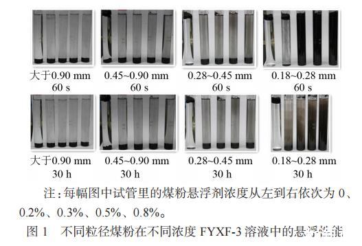 粒徑方面,粒徑大于0.90mm、0.45~0.90mm的煤粉懸浮效果較差,粒徑為0.28~0.45mm的煤粉效果顯著且沒有明顯分層現象;濃度方面,FYXF-3濃度越大,懸浮效果越好,濃度不小于0.3%后,懸浮效果顯著。