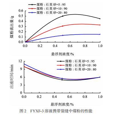 圖2為FYXF-3的濃度分別與出液時間、煤粉流出量的關系圖;圖3為煤粉:石英砂比例為5:95時的實驗現象圖。