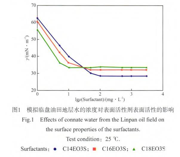 使用模擬臨盤油田地層水將表面活性劑配制成溶液,考察油田地層水對表面活性劑表面活性的影響,實驗結果見圖1。由圖1可看出,在該油田地層水中,C14EO3S,C16EO3S,C18EO3S的cmc依次為80,40,10 mg/L,其所對應的γcmc分別為28.86,32.38,33.75 mN/m。與C14EO3S在蒸餾水中的cmc相比,C14EO3S在油田地層水的cmc降低了20 mg/L。由文獻[1]的報道可知,在該油田地層水中,C14EO6S,C16EO6S,C18EO6S表面活性劑的cmc依次為100,50,50 mg/L,其所對應的γcmc分別為29.14,36.74,34.65 mN/m。實驗結果表明,隨EO數的增加,脂肪醇聚氧乙烯醚磺酸鹽表面活性劑在油田地層水中的cmc和其所對應的γcmc均有不同程度的增大。