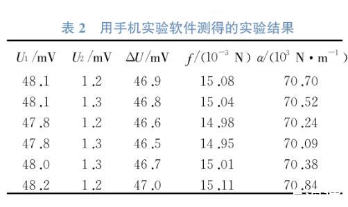 利用改裝后的液體表面張力系數測量儀和手機實驗軟件記錄實驗數據,實驗數據可在手機屏幕實時顯示,拖動手機屏幕找到“拉斷液柱”時所對應的數據,測得的U1和U2數據如表2所示。