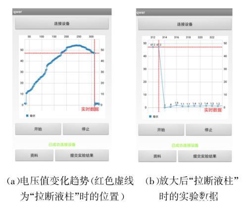 針對傳統實驗模式中記錄數據的缺點,在智能手機上開發了專門的實驗軟件,通過手機的藍牙連接到實驗儀器,將實驗所采集到的所有電壓表讀數實時傳送到智能手機上,然后在智能手機上以坐標點的形式描繪出電壓表讀數的變化,在智能手機端就可以觀察到金屬環與液面分離瞬間的數據變化,很方便地讀取到“拉斷液柱”瞬間的實驗數據。