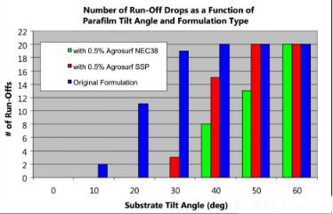 原始配方中超過一半以上的液滴在20°的傾斜角滾落,40°時,全部液滴滾落。Agrosurf NEC38比Agrosurf SSP更有效,可防止所有液滴在30°時滾落,避免60%的液滴在40°滾落。客戶可根據(jù)這種方法,尋找更加優(yōu)異的表面活性劑。