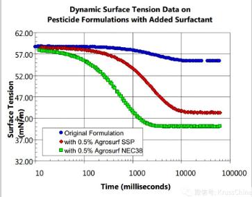 我們分別用Kibron動態(tài)表面張力儀,DSA100液滴形狀分析儀,從動態(tài)表面張力,接觸角和滾動角的角度,來全面衡量和評價0.5wt%的Agrosurf SSP、0.5wt%的Agrosurf NEC38對農(nóng)藥的噴灑效果。