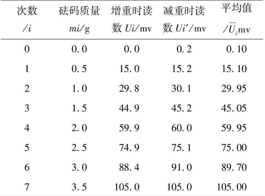 對(duì)于力敏傳感器靈敏度的測量,保持不增加實(shí)驗(yàn)成本的原則,采用多次測量,先依次增加片碼個(gè)數(shù),再依次減少片碼個(gè)數(shù)的方法平均人為誤差,然后用逐差法求得力敏傳感器的靈敏度,具體測量數(shù)據(jù)如表1所示。