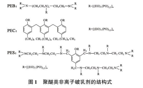 實驗用破乳劑HY01是季銨鹽類陽離子破乳劑,相對分子質(zhì)量約6 000,固含量約35%;其他破乳劑為聚醚類非離子表面活性劑,平均相對分子質(zhì)量均在5 000左右,EO(乙氧基)∶PO(丙氧基)=1∶2.3。3種聚醚類非離子破乳劑的結(jié)構(gòu)式見圖1,其中PEB是支狀聚醚類非離子破乳劑,屬于多乙烯多胺聚氧乙烯聚氧丙烯醚型破乳劑,PEC是梳型聚醚類非離子破乳劑,屬于酚醛樹脂聚氧乙烯聚氧丙烯醚型破乳劑,PES是星型聚醚類非離子破乳劑,屬于酚胺醛樹脂聚氧乙烯聚氧丙烯醚型破乳劑。