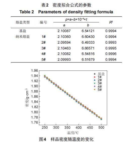 文獻(xiàn)中提出,在熔融鹽中加入SiO2納米顆粒后,由于分子間作用力和納米熔鹽配制過程中的攪拌作用,熔融鹽和納米顆粒在熔鹽體系中會(huì)形成一種納米云核。納米云核中納米顆粒被大量的熔融鹽包裹,此時(shí)SiO2納米顆粒的密度對納米云核的密度影響可以忽略不計(jì),納米云核的密度始終與基鹽的密度保持一致。