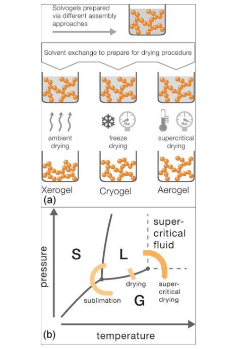 將濕凝膠中的液體轉(zhuǎn)變?yōu)闅怏w,同時維持骨架結(jié)構(gòu)和體積不變(或較少變化),是氣凝膠制備的另一個核心步驟。如圖5(a)所示,常用的干燥方法有三種:(1)常壓干燥(ambient pressure drying,簡稱APD),得到體積收縮巨大、高密度、孔洞極少的干膠(xerogel)。(2)冷凍干燥(freeze drying),得到體積較少收縮的凍干膠(cryogel)。(3)超臨界流體干燥(supercritical liquid drying,簡稱SCLD),得到體積和結(jié)構(gòu)都較少變化的氣凝膠。
