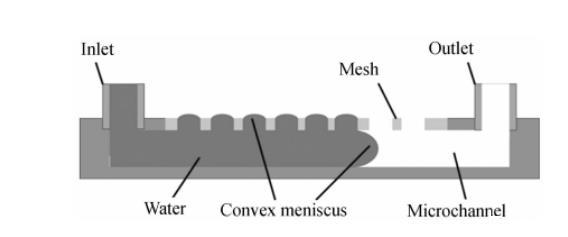 氣溶膠到水溶膠的采樣,一方面要求管道是開放的,以保證空氣中的生物質能夠進入液體;另一方面為了避免液體在流動過程中外泄,管道必須封閉。本文設計了一種開放的管道,其頂部開放面覆蓋有疏水柵網,如圖1所示。疏水柵網孔中的水在表面張力的作用下會形成一個彎月面,阻止水從柵網孔中流出。這樣空氣中的生物質就能通過柵網孔進入管道,同時管道中的液體可以穩定流動而不會外溢。