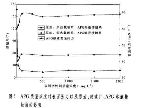 圖1 APG質量濃度對表面張力以及原油、載玻片、APG溶液接觸角的影響