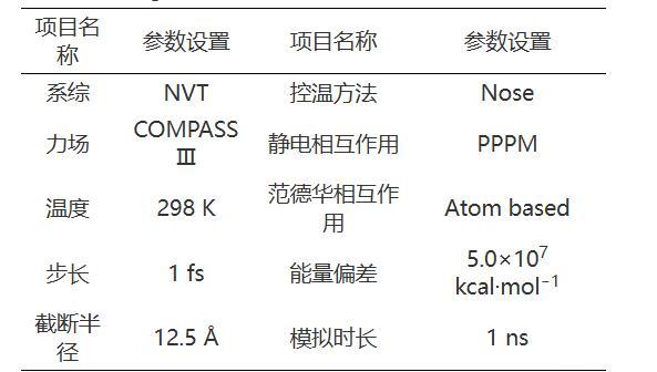 分子動力學模擬過程由Forcite模塊完成。初始泡沫體系的結構并不穩(wěn)定,需對泡沫初始模型進行結構優(yōu)化以獲得穩(wěn)定的低能量泡沫結構。在分子動力學模擬開始前,利用Forcite模塊中的Anneal對幾何優(yōu)化后的泡沫模型進行退火操作。利用Dynamic進行分子動力學模擬,系綜、力場、溫度等相關參數(shù)設置情況見表1。