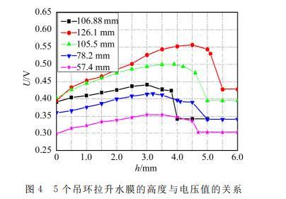 圖2是WBM-1A拉脫法液體表面張力實驗儀,用來測定純凈水的表面張力系數(shù)。實驗時采用標(biāo)準吊環(huán)的內(nèi)、外徑分別為d1=33.10 mm,d2=34.96 mm,平均直徑為d?=34.03 mm,平均周長為πd?=106.88 mm。該標(biāo)準環(huán)拉出的水膜高度與力敏傳感器電壓讀數(shù)之間的關(guān)系,如圖3所示。可以看出,隨著水膜高度的增加,吊環(huán)拉力逐漸增加到最大(圖中Umax表示),然后慢慢減小,直至水膜斷裂。圖中U斷前和U斷后分別表示水膜斷裂時和斷裂后的瞬時電壓值。吊環(huán)的受力變化情況與之前理論分析一致。