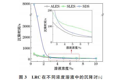 LRC在不同濃度溶液中的沉降時間和沉降速率曲線如圖3和圖4所示。由圖3可知,當(dāng)溶液濃度處于0.5‰至2‰之間時,煤塵在3種溶液中的沉降時間迅速縮短;當(dāng)濃度大于2‰時,煤塵沉降時間差異不大。當(dāng)CSDS≤1‰時,煤塵在SDS溶液中的沉降時間大于1 h,因此,SDS在此濃度范圍內(nèi)不能快速潤濕LRC。當(dāng)CALES和CSLES高于0.5‰時,煤塵沉降時間持續(xù)緩慢縮短,該濃度范圍內(nèi)ALES、SLES溶液潤濕煤塵的時間小于500 s。由此可知,低濃度下ALES、SLES溶液比SDS溶液更容易潤濕LRC。由圖4可知,當(dāng)溶液濃度大于3‰時,煤塵在SDS溶液中的沉降速度大于SLES溶液,拐點(diǎn)處于2‰至3‰之間。因此,當(dāng)溶液濃度小于拐點(diǎn)濃度時,3種溶液潤濕LRC的能力排序為ALES>SLES>SDS;當(dāng)溶液濃度大于拐點(diǎn)濃度時,3種溶液潤濕LRC的能力排序為ALES>SDS>SLES。上述分析表明,高、低濃度的ALES溶液對LRC均具有較強(qiáng)的潤濕性。