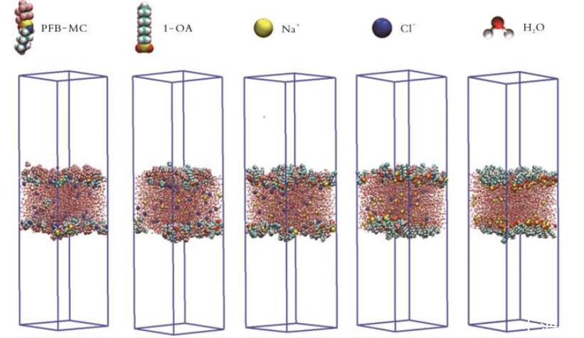 MD模擬在原子尺度解析短鏈氟碳復配體系(如陰/陽離子型、氟碳/碳氫混合型)的多組分協同機制方面具有獨特優勢,能定量揭示界面分子排布、相互作用及微觀?宏觀關聯。圖8為不同n(PFB?MC)/n(1?OA)復配體系的最終MD模擬模型。