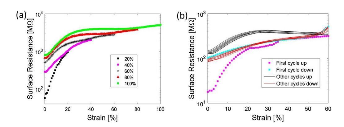 圖6a顯示了在20%和100%之間增加最大應變的不同連續循環中,樣品表面電阻的變化。僅顯示拉伸循環。在前20%應變期間,電阻增加約一個數量級,表明MWCNT網絡內的互連比降低。當恢復到0%應變時,電阻沒有達到其初始值,而是增加了6倍。這突出了由于機械變形導致的電性能的不可逆變化。隨著最大施加應變的增加,每個循環都會發生這種情況。然而,可以觀察到,在恢復到0%應變后,表面電阻的增加在60%應變以上不太明顯。值得注意的是,單層電極在100%單軸應變下仍保持導電。